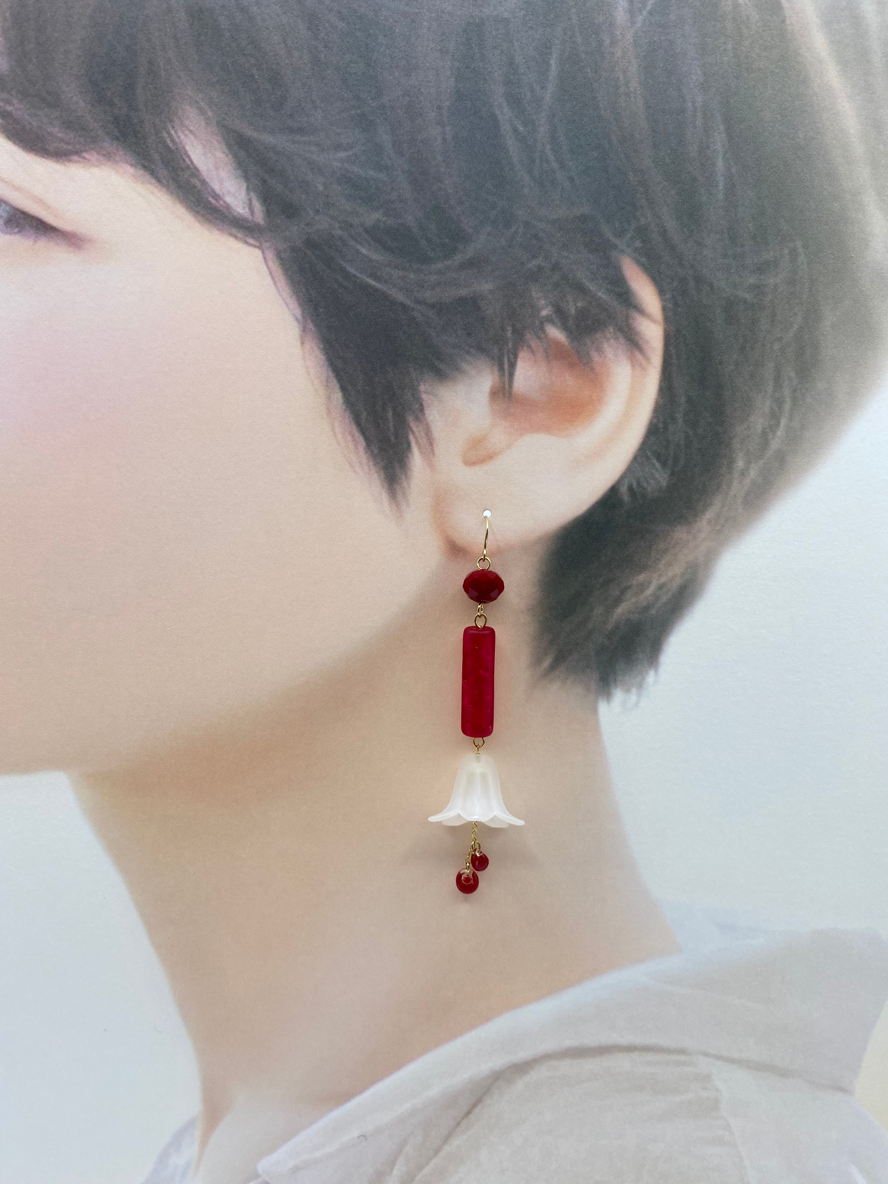 赤い円柱型のビンテージアクリルビーズを使った お花のパーツの揺れる感じが可愛いロングピアスです。