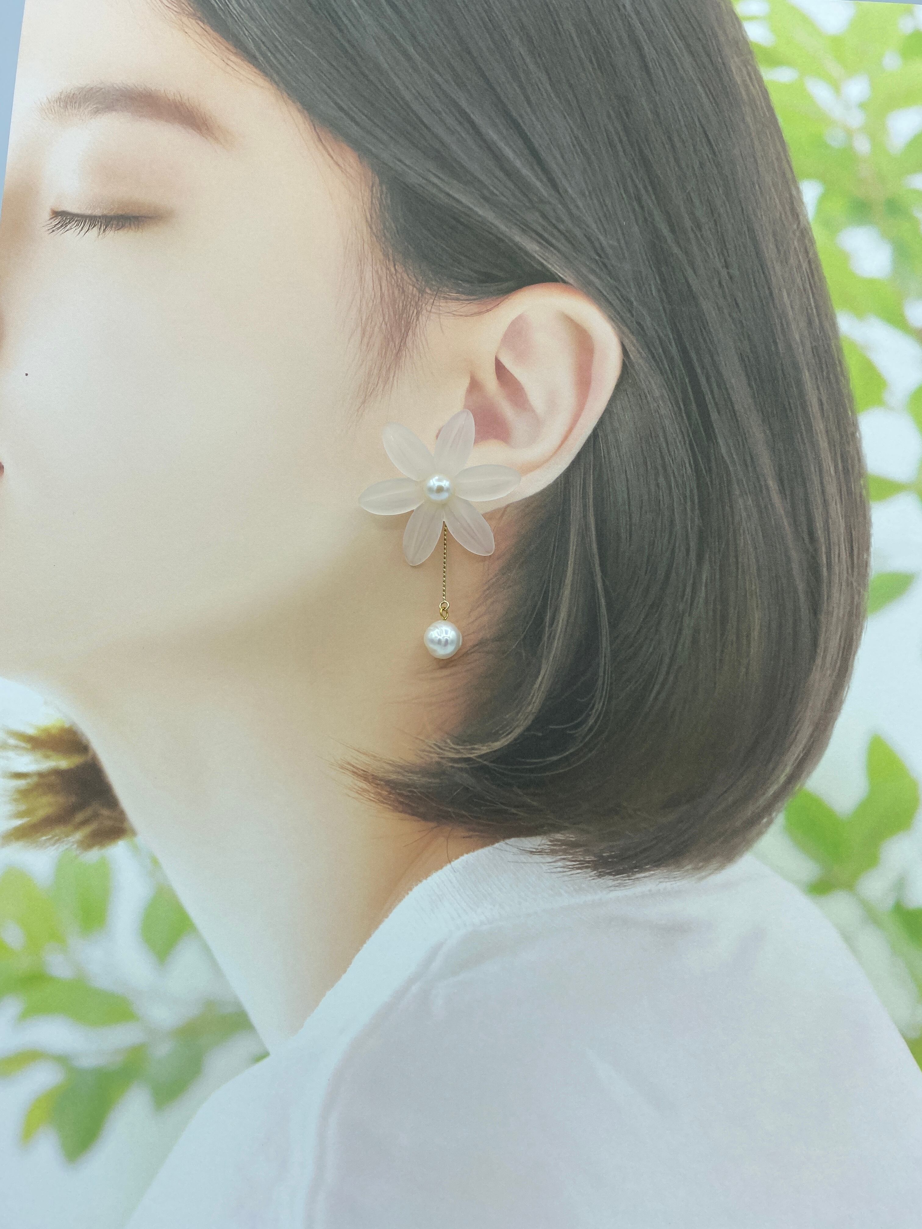 大きめの半透明のお花の中に淡水パール、そしてお花の後ろから揺れる淡水パール。華やかで、可愛い 大ぶりのピアスです。