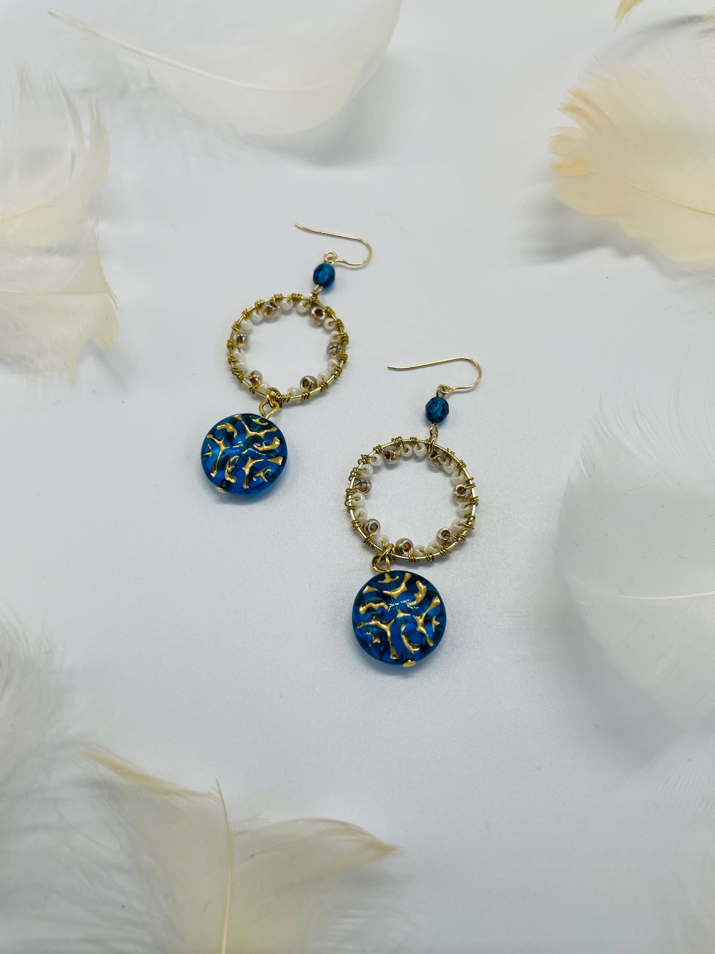 リングにビーズを巻き付けチェコガラスをぶら下げました。チェコガラスにはゴールドが遇らわれていてちょっとゴージャスです。小ぶりに仕上げました