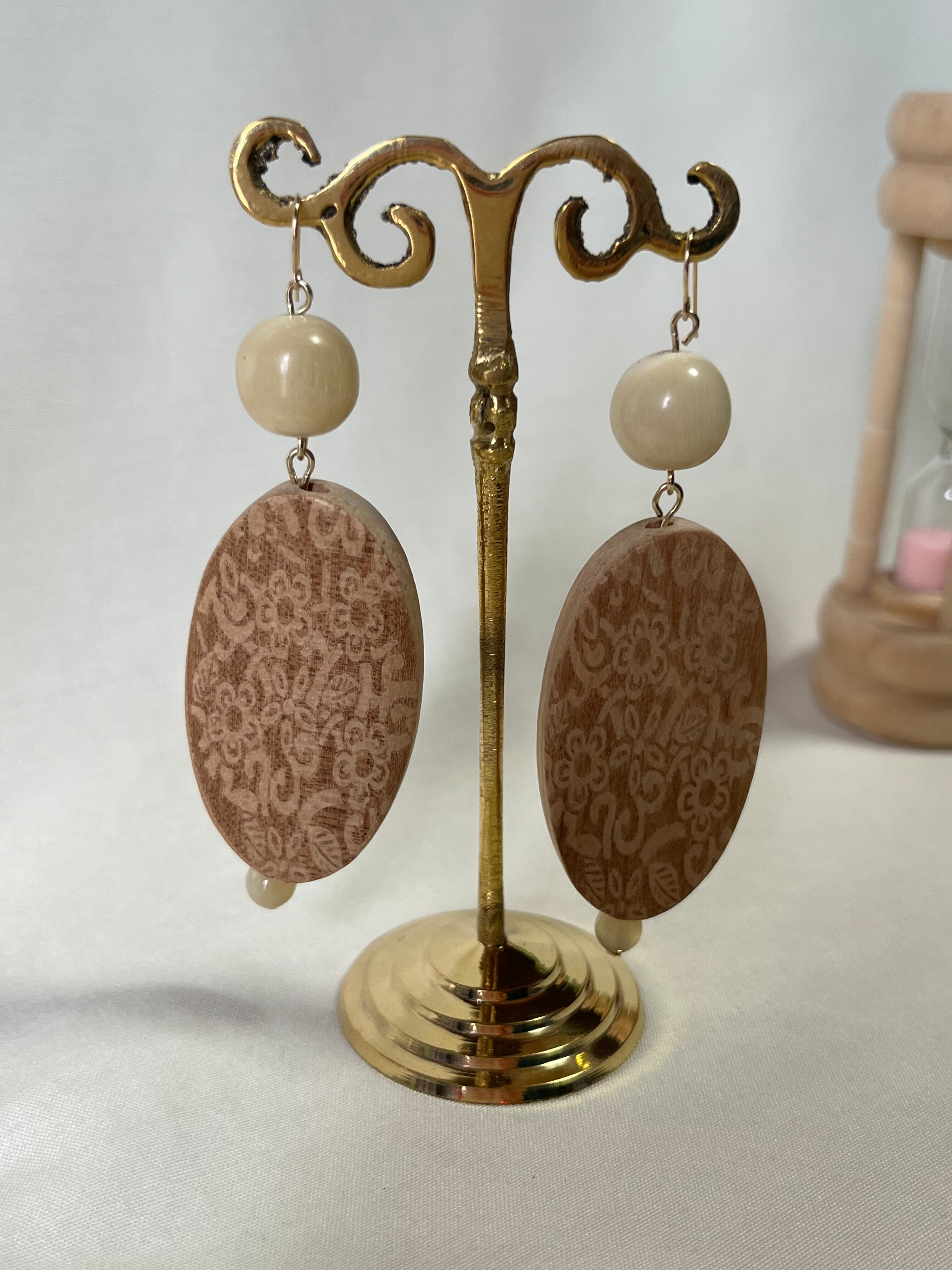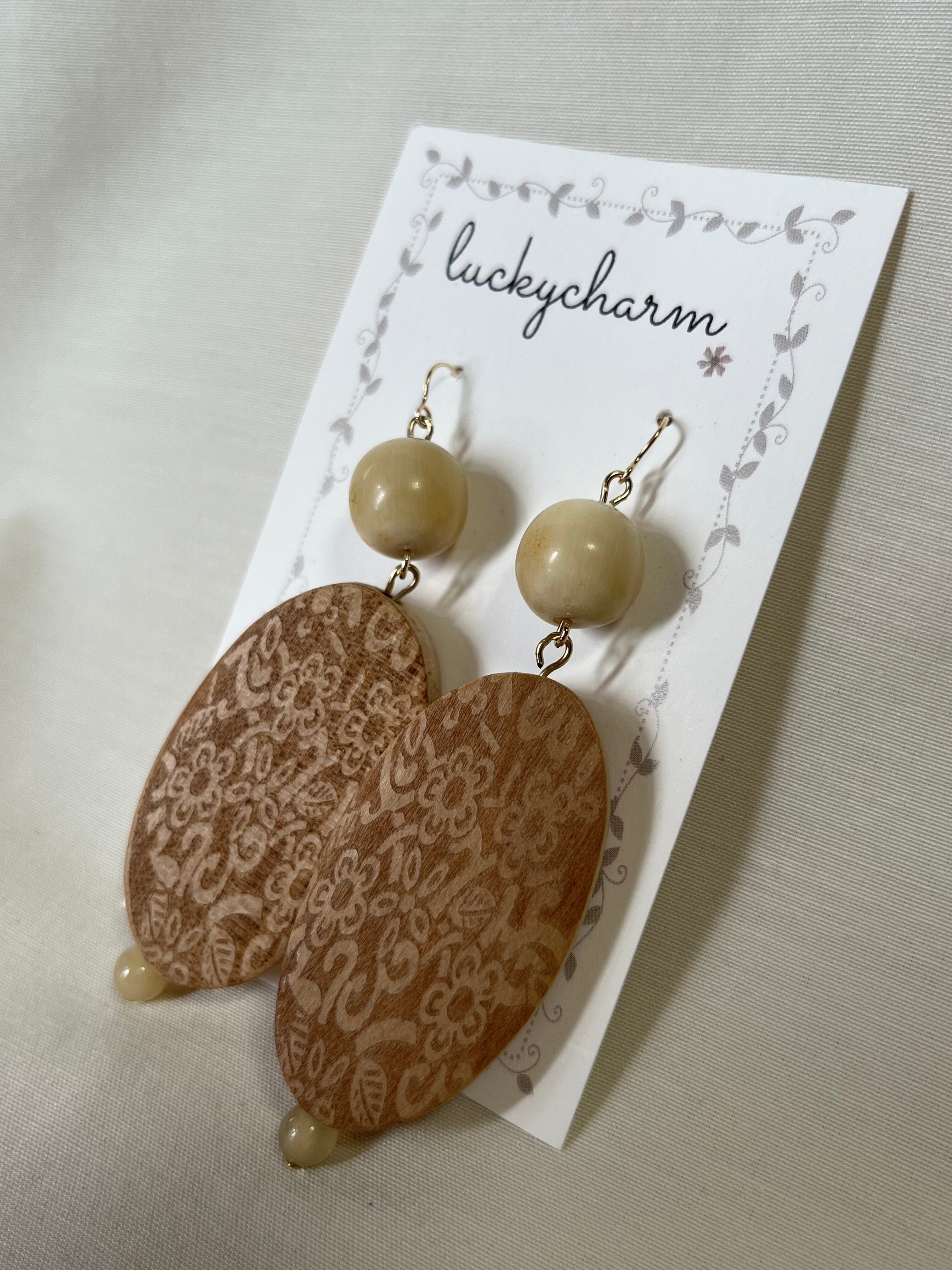 水牛角で出来た小さなパーツと大きな柄付きウッドピアスです。